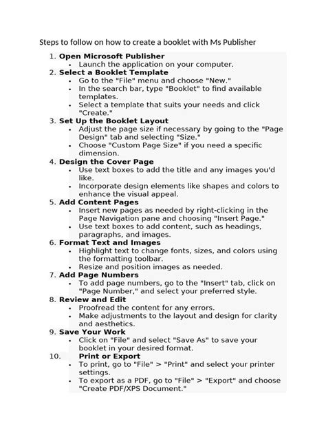 To really make your booklet stand out, it’s important to pay attention to formatting and design. Let’s talk about some tips to give your booklet a professional edge. Choose the right fonts . Your font choices can significantly impact the readability and overall aesthetic of your booklet. Stick to a limited number of fonts (two or three at most) to maintain consistency. Use one font for headings and another for body text. Select fonts that are easy to read and appropriate for your target audience. Avoid overly decorative or script fonts for large blocks of text, as they can be difficult to read. Use color effectively . Color can be a powerful tool for creating visual interest and conveying your message. Use a consistent color palette throughout your booklet. Consider using a color wheel to select complementary colors that work well together. Avoid using too many colors, as this can make your booklet look cluttered and unprofessional. Use color to highlight important information or to create a sense of hierarchy. Incorporate high-quality images . Images can enhance your booklet and make it more engaging. Use high-resolution images that are clear and sharp. Avoid using pixelated or blurry images, as they will detract from the overall quality of your booklet. Crop and resize images as needed to fit your layout. Consider using images that are relevant to your content and that support your message. Pay attention to spacing and alignment . Consistent spacing and alignment are crucial for creating a clean and professional look. Use the guides and rulers in Publisher to align elements precisely. Pay attention to the spacing between lines of text, paragraphs, and images. Avoid crowding elements together, as this can make your booklet look cluttered. Use white space effectively . White space, also known as negative space, is the empty space around text and images. Using white space effectively can help to create a sense of balance and visual appeal. Avoid filling every inch of your booklet with content. Leave plenty of white space around elements to give them room to breathe. By following these formatting and design tips, you can create a booklet that looks professional, polished, and visually appealing. Remember, the goal is to create a booklet that is both informative and aesthetically pleasing. So, take your time, experiment with different design options, and always strive for excellence. You’re doing great!