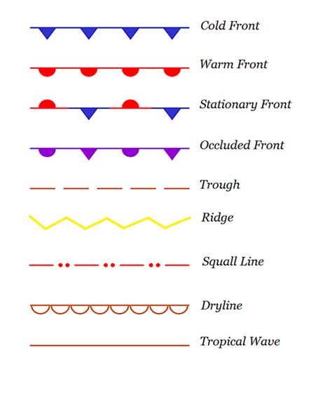 • Fronts : These are boundaries between different air masses. Cold fronts (triangles) bring cooler air and often storms, while warm fronts (semicircles) usher in warmer air. Stationary fronts (alternating triangles and semicircles) mean the boundary is not moving much.