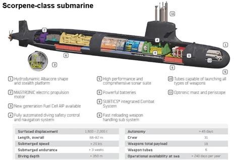 Alright, let’s get down to the nitty-gritty. The Scorpene submarine is a product of collaboration. Designed by French naval defense company DCNS (now Naval Group) and Spanish shipbuilder Navantia, this submarine boasts a modular design, meaning it can be adapted to meet the specific needs of different navies. This flexibility is a huge selling point, allowing for customization in terms of weaponry, sensors, and even crew accommodations. The core of the Scorpene’s design revolves around stealth, endurance, and lethality. Its hydrodynamic hull shape, optimized for underwater operations, contributes to its low acoustic signature, making it difficult to detect. The Scorpene typically displaces around 1,700 to 2,000 tons when submerged, depending on the specific variant. This allows it to navigate both shallow coastal waters and the deeper reaches of the ocean. Inside, the submarine is packed with advanced technology. This includes a sophisticated combat management system, sonar arrays for detecting and tracking targets, and various communication systems. The Scorpene is equipped with a range of weaponry, including torpedoes, anti-ship missiles, and, in some cases, the ability to launch land-attack cruise missiles. The submarine’s propulsion system usually consists of a diesel-electric setup, but some versions have been equipped with an air-independent propulsion (AIP) system. This AIP system allows the submarine to remain submerged for extended periods without needing to surface to recharge its batteries, significantly enhancing its stealth and operational endurance. The AIP system is a game-changer, giving the Scorpene a distinct advantage in terms of operational flexibility and the ability to conduct covert missions. The crew size of a Scorpene submarine typically ranges from 30 to 35 personnel, depending on the specific configuration and the mission requirements. Life aboard a submarine can be challenging, but these vessels are designed to provide a comfortable and safe environment for the crew during extended deployments. The design and features of the Scorpene submarine are a testament to modern naval engineering. From its stealthy hull design to its advanced combat systems, every aspect of the submarine is geared towards achieving operational effectiveness and ensuring the safety of the crew.