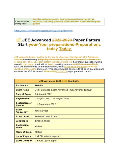 The JEE Advanced exam pattern is subject to change from year to year. It is essential to stay updated with the latest changes and modifications in the exam pattern . The official JEE Advanced website is the best source of information for the latest updates. Make sure you regularly visit the website and read the information brochure carefully. Any changes in the syllabus, marking scheme, or exam structure will be announced on the website. Staying informed about the latest updates will help you prepare effectively and avoid any surprises during the exam.