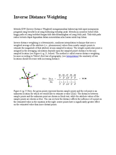 Mastering Inverse Distance Weighting for Spatial DataWhen you’re diving into the fascinating world of spatial data, Inverse Distance Weighting (IDW) is one of those fundamental techniques you’re bound to encounter. It’s a super popular and remarkably intuitive method used by GIS professionals , data scientists , and environmental researchers alike to estimate values at unmeasured locations based on a set of known points. Think of it like this: if you’re trying to figure out the temperature in a spot where you don’t have a thermometer, you’d naturally look at the temperatures of nearby weather stations, right? And you’d probably give more importance to the stations that are closer to your target location. Well, folks, that’s the core idea behind IDW in a nutshell! It’s all about how proximity influences value, making it an indispensable tool for spatial interpolation . We’re talking about predicting anything from pollution levels across a city to soil moisture in a field, or even mineral concentrations in a geological survey. Understanding IDW isn’t just about memorizing a formula; it’s about grasping a powerful concept that can unlock deeper insights from your geographic data . This article is your friendly guide to everything IDW – we’ll break down what it is, how it works, its strengths, weaknesses, and how you can apply it like a pro in your projects. So buckle up, because we’re about to make spatial interpolation less intimidating and way more actionable for you guys! The goal here is to equip you with the knowledge to not just use IDW, but to truly master it, ensuring your spatial analysis leads to robust and reliable predictions . We’ll explore various aspects, including how distance plays a crucial role and the implications of different weighting parameters , all while keeping things casual and easy to digest. You’ll learn when IDW is your best friend and when you might need to look for other interpolation techniques , empowering you to make informed decisions in your data endeavors. It’s time to transform raw spatial data into meaningful, continuous surfaces.### What Exactly is Inverse Distance Weighting (IDW)?At its heart, Inverse Distance Weighting (IDW) is a deterministic spatial interpolation method that relies on the simple, yet profound, principle that things closer to each other are more alike than things farther apart. Imagine you’re mapping the spread of a chemical spill; the concentration will likely be highest near the source and decrease as you move away. IDW leverages this concept by assigning more weight or influence to observed points that are closer to the location where you want to make a prediction . Conversely, points that are farther away receive less weight, meaning their values contribute less to the estimated value. This distance-based weighting is what gives the method its name: inverse distance , because as distance increases, the weight decreases. It’s truly a straightforward and intuitive approach that makes spatial data analysis accessible even for beginners, yet powerful enough for complex environmental modeling and resource management tasks. We’re essentially creating a continuous surface from discrete sample points, turning scattered data into a comprehensive spatial representation .The core mechanism of Inverse Distance Weighting involves calculating a weighted average of the values from your known sample points. For any unknown location , the value is estimated by taking the values of the surrounding known points and multiplying them by a weight. This weight is inversely proportional to the distance between the known point and the unknown location, raised to a certain power. This power parameter , often denoted as ‘p’, is super important because it controls how rapidly the influence of surrounding points diminishes with increasing distance. A larger ‘p’ means that only the very closest points will have a significant say in the estimate, resulting in a more localized and potentially jagged surface. A smaller ‘p’, on the other hand, allows more distant points to exert a greater influence, leading to a smoother, more generalized surface. Choosing the right power parameter is often one of the trickiest, yet most critical, decisions you’ll make when applying IDW, as it directly impacts the accuracy and visual representation of your interpolated surface . It’s not a one-size-fits-all situation, guys; it often requires a bit of experimentation and understanding of your specific dataset and the spatial phenomena you’re modeling.The beauty of Inverse Distance Weighting lies in its conceptual simplicity and relatively easy implementation in various GIS software and programming languages . Unlike some more complex geostatistical methods like Kriging , IDW doesn’t require assumptions about the statistical distribution or spatial autocorrelation of your data. This makes it a go-to choice when you need a quick, reliable estimate and when geostatistical models might be overkill or too computationally intensive. However, this simplicity also comes with certain caveats, which we’ll explore later on. For now, just remember that IDW is your friend for creating continuous surfaces from discrete point data by prioritizing proximal information . It’s commonly used for environmental monitoring , such as mapping air pollution concentrations , precipitation totals , or groundwater levels , as well as in geology for ore body estimation and in urban planning for population density mapping . The ability to visualize and analyze spatial patterns from scattered data is invaluable, and IDW provides a solid foundation for many such applications. Keep in mind that while it’s deterministic , meaning it will always produce the same result given the same inputs, it’s also a powerful tool for initial exploratory data analysis and generating predictive maps .### The Math Behind the Magic: How IDW WorksAlright, let