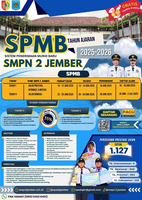 Thinking about applying? Here’s what you need to know about admissions! If you’re considering applying to SMPN 2 Jember , it’s essential to understand the admissions process. The school typically announces its admissions period well in advance, providing prospective students and their families ample time to prepare. The application process usually involves submitting an application form, along with supporting documents such as academic transcripts, birth certificates, and other relevant records. SMPN 2 Jember often conducts entrance exams to assess the academic readiness of applicants. These exams may cover subjects such as Mathematics, Science, and Language. In addition to entrance exams, the school may also conduct interviews to evaluate the applicant’s personality, motivation, and fit with the school’s culture. The admissions criteria typically include academic performance, entrance exam scores, interview results, and any extracurricular achievements. SMPN 2 Jember aims to create a diverse and well-rounded student body, so they may also consider factors such as geographic representation and socioeconomic background. The school provides detailed information about the admissions process on its website and through information sessions. It’s recommended to attend these sessions to learn more about the school and ask any questions you may have. The admissions process can be competitive, so it’s important to prepare thoroughly and submit a complete and well-prepared application. The school also offers guidance and support to prospective students and their families throughout the admissions process. They may provide sample entrance exams, tips for preparing for the interview, and other helpful resources. The admissions team is dedicated to ensuring a fair and transparent process, and they are available to answer any questions or concerns. The goal is to select students who are not only academically strong but also demonstrate the potential to contribute to the school’s community and uphold its values. The admissions process is a critical step in joining the SMPN 2 Jember family, and it’s important to approach it with diligence and enthusiasm.