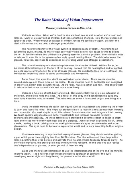 This is the million-dollar question, right? Does The Bates Method actually work? Well, the jury is kind of still out in the mainstream medical community. Most ophthalmologists today believe that common vision problems like myopia (nearsightedness), hyperopia (farsightedness), and astigmatism are primarily caused by the physical shape of the eyeball or the cornea, which The Bates Method doesn’t directly address. They argue that exercises can’t change the physical structure of the eye. However, a huge number of people claim to have experienced significant improvements using these techniques. They report reduced eye strain, less fatigue, improved visual comfort, and even a decrease in their need for corrective lenses. Proponents suggest that while the method might not cure underlying refractive errors caused by eye shape, it can significantly improve visual function . They argue that by reducing strain and improving eye habits, the eyes can learn to focus more effectively, leading to clearer vision. It’s possible that the relaxation and conscious use of the eyes can help the eye muscles work more efficiently, or perhaps improve the brain’s interpretation of visual information. Many people find that the practices help with eye strain and fatigue associated with prolonged screen time or reading, which is a common complaint in our digital age. So, while it might not be a magic bullet for everyone, it’s clear that the focus on relaxation and mindful eye use can bring tangible benefits for many. It’s definitely worth exploring if you’re looking for natural ways to improve your visual comfort and potentially enhance your vision.